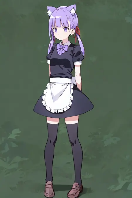 rokuro-chan, maid apron, purple bowtie, puffy short sleeves, low twintails, red ribbon, animal ear fluff, black thighhighs, brown loafers, purple hair, bandaid on nipples