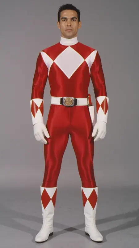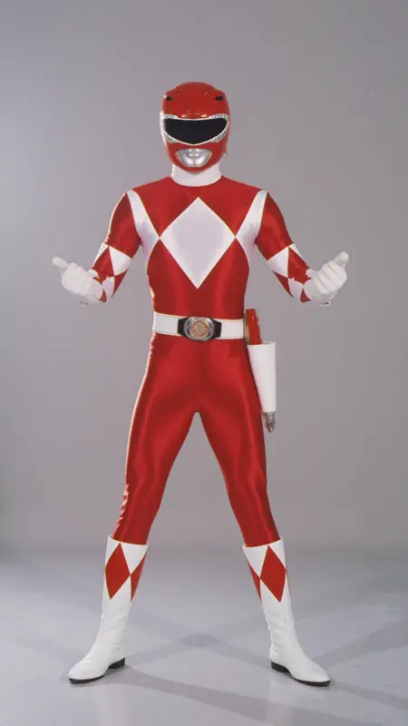 一个男人穿着Mmpr1993红色制服并佩戴头盔