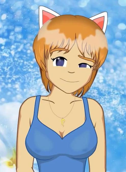 ninelakimova, 1girl, solo, cat ears, ginger hair, collarbone, blue women's top, half heart pendant,