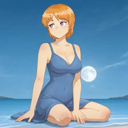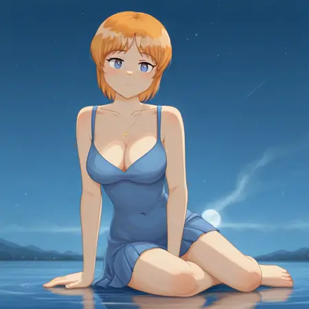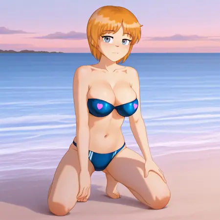 ninelakimova, 1girl, solo, ginger hair, collarbone, blue bra-swimsuit with two hearts on the chest,