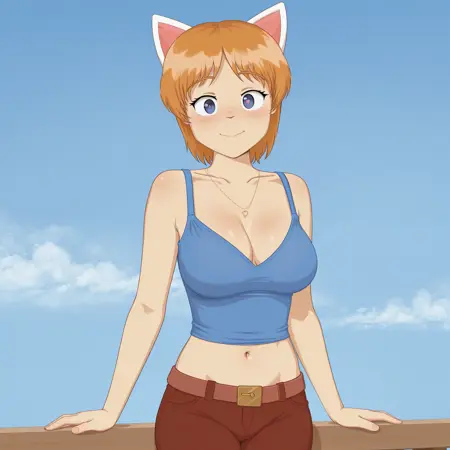 ninelakimova, 1girl, solo, cat ears, ginger hair, collarbone, blue women's top, half heart pendant, navel, brown denim pants,
