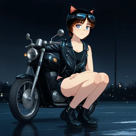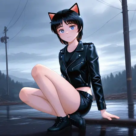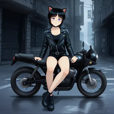 ninelakimova, 1girl, solo, cat ears, black and ginger hair, black tank top, black leather jacket,