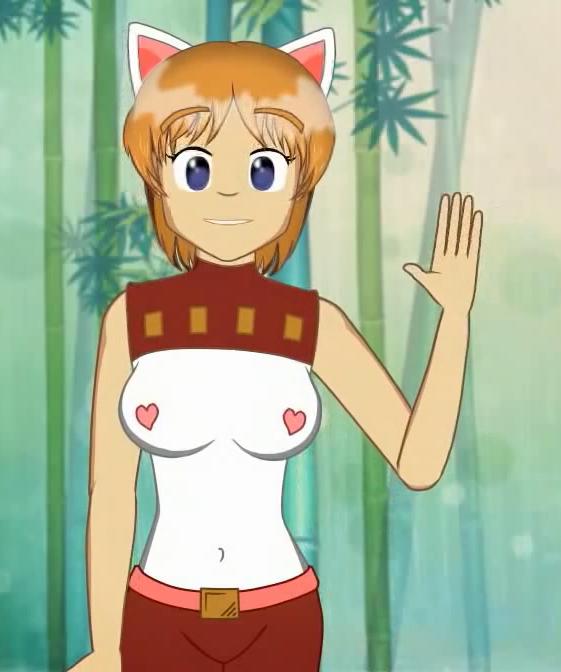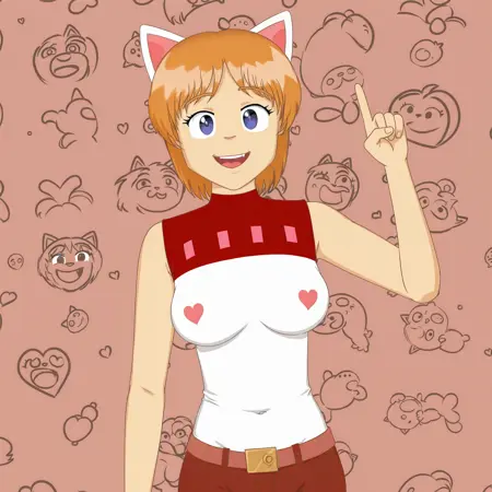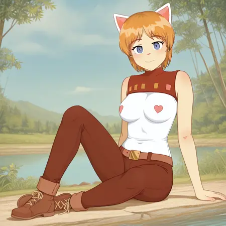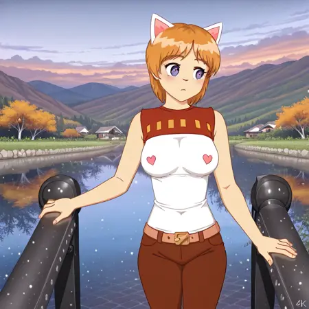 ninelakimova, 1girl, solo, cat ears, ginger hair, sleeveless t-shirt with two hearts on the chest, brown denim pants,
