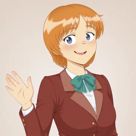 ninelakimova, 1girl, solo, ginger hairbrown women's blazer, green bow on the neck,