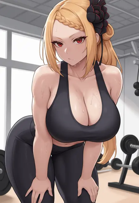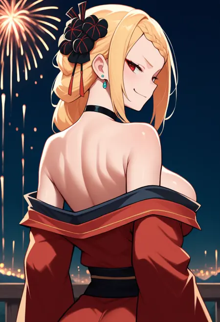 触发词 + 外貌: bar1elle, 长发, 金发, 编发刘海, 法式编发, 头发花饰, 黑色花朵, 红色眼睛, 大胸
