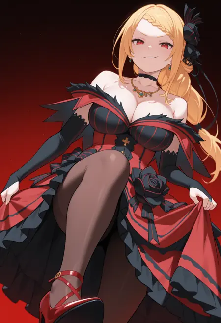 기본 옷차림: 계층적 드레스, 빨간 드레스, 어깨露出 드레스, 털 장식 드레스, 드레스 리본, 검은 리본, 줄무늬 리본, 드레스 꽃, 검은 장미, 검은 장갑, 팔꿈치 장갑, 신부용 장갑, 귀걸이, 검은 목걸이, 목걸이, 드러난 어깨, 빗장뼈, 가슴선