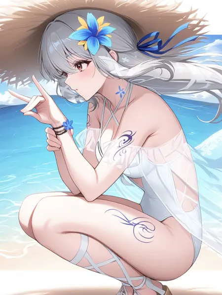 프롬프트 예시: natu,solo,full body,swimsuit,grey hair,brown eyes,hair ribbon,hair ornament,straw hats,see-through clothes,arm tattoo,leg tattoo,cross-laced footwear,sandals,ocean,back tattoo,