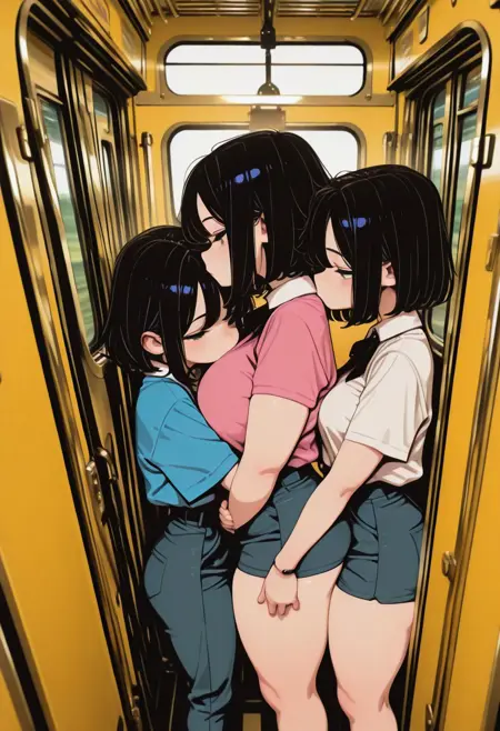 자세: 일반적으로 세 명으로 구성된 그룹이 샌드위치 허그를 하고 있는 모습. Pony을 더 이상 믿지 못하기 때문에 일러스트 기반입니다.