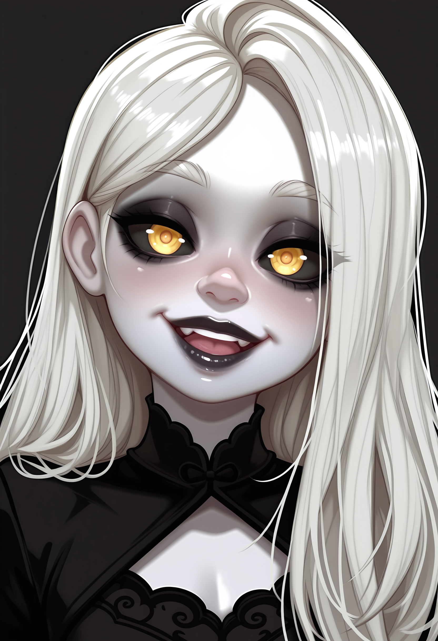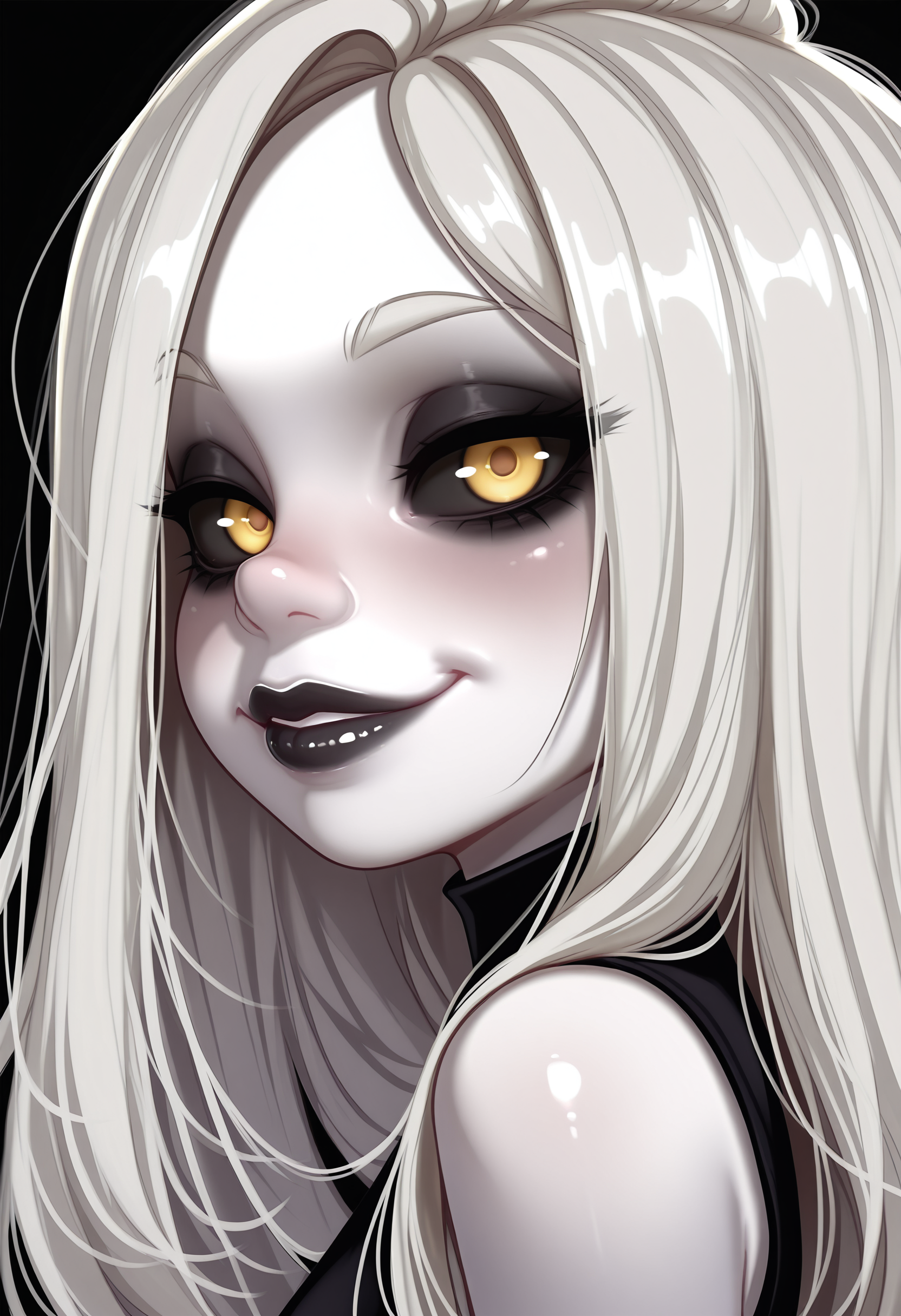 이 스타일로 지헤나 소녀를 만드는 예시: 1girl, colored skin, white skin, white hair, side swept hair, long hair, colored sclera, black sclera, yellow eyes, black dress, black lips, black eyeshadow
