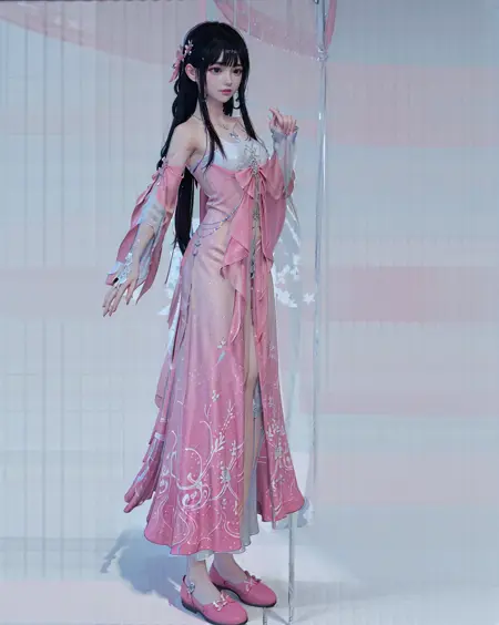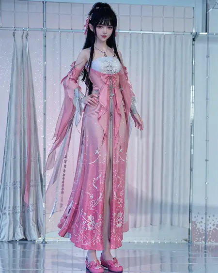 1girl,solo,lora:\[衣服\]-\[九嶷琼芳-天刀少女\]TDSVjyqf:0.6,TDSVjyqf,(early teen:1.2),(petite:1.2),baby face,long_skirt,pink dancing shoes,(standing:1.2),(full body:1.5),(simple background:1.2),indoor,(looking_at_viewer:1.2),(best quality),((masterpiece)),