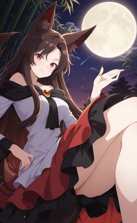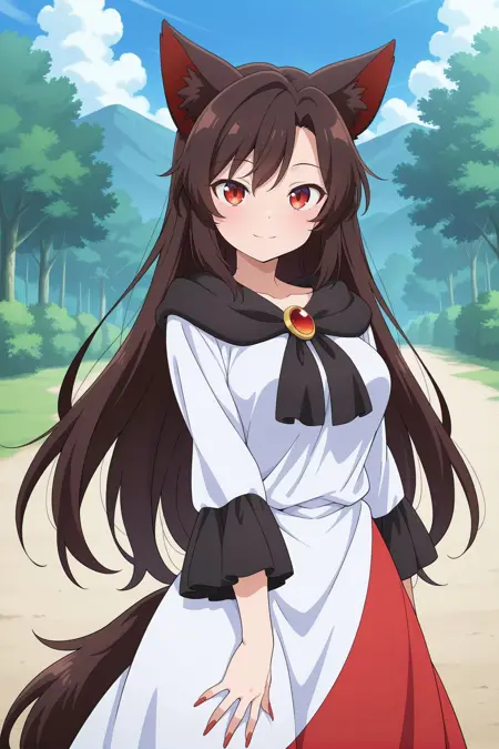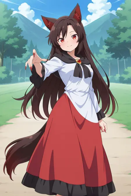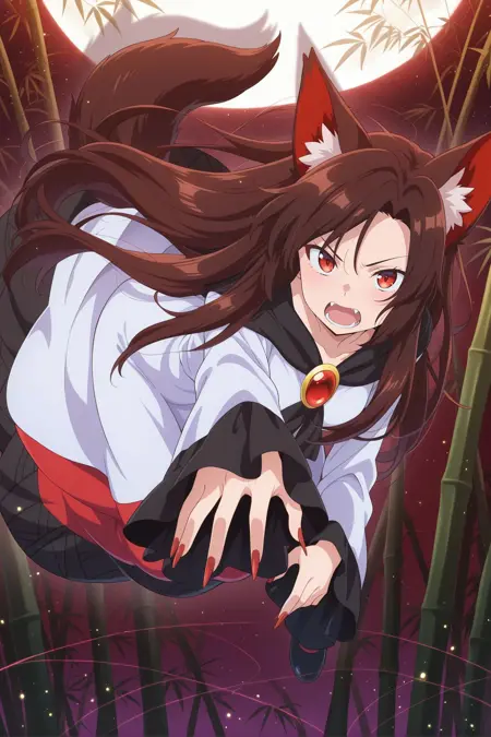 imaizumi kagerou, 1girl, solo, red eyes, brown hair, long hair, wolf ears, wolf tail, long fingernails,