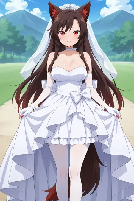 imaizumi kagerou, 1girl, solo, red eyes, brown hair, long hair, wolf ears, wolf tail, long fingernails, alternate costume, back bow, white bow, bridal veil, white choker, elbow gloves, white gloves, frilled dress, white dress, wedding dress, white pantyhose,