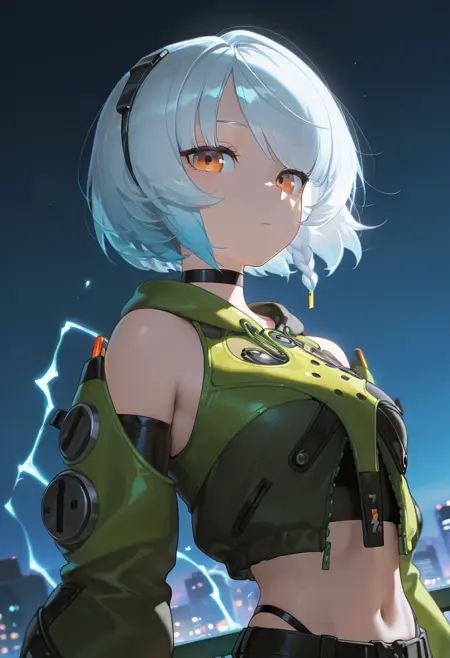 Tags for her look: 1girl, solo, short hair, grey hair, orange eyes, side braid,