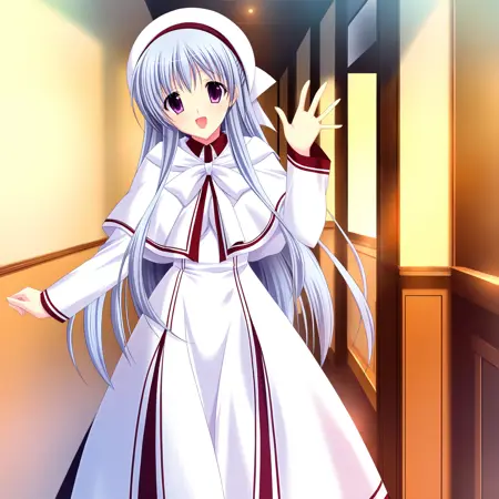 hat,beret,white capelet,long sleeves,white dress,red collar,