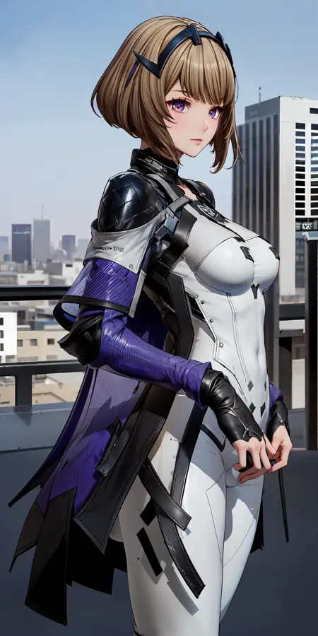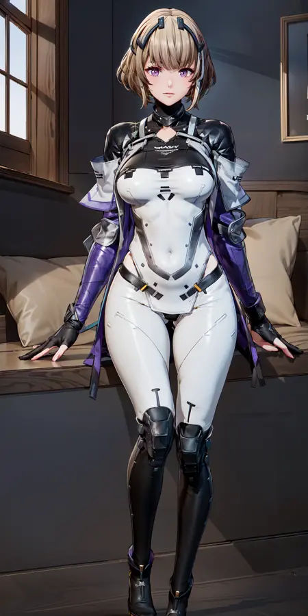 Positive prompt words: molianA1CB, 1girl, purple eyes, short hair, brown hair, purple_see-through_cape, white_bodysuit, see-through, see-through sleeves, gloves, boots, hairband, hair ornament,