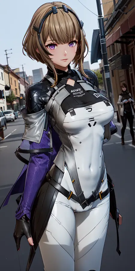 1. 긍정적 프롬프트: molianA1CB, 1girl, solo, standing, looking at viewer, purple eyes, short hair, brown hair, purple_see-through_cape, white_bodysuit, see-through, see-through sleeves, gloves, boots, hairband, hair ornament, medium breasts, naughty face, cowboy shot, outdoors, street, blue sky, tree, city, sunny, summer, day, sunlight, cowboy shot, masterpiece, best quality, (colorful), (finely detailed beautiful eyes and detailed face), cinematic lighting, extremely detailed CG unity 8k wallpaper, lora:molianA1CB-v1:0.65