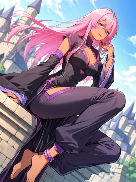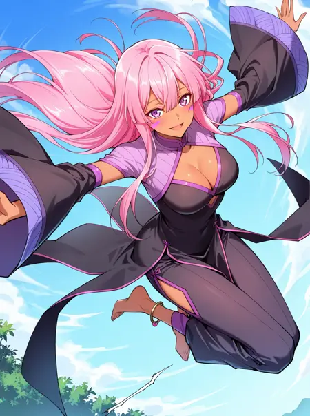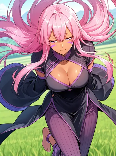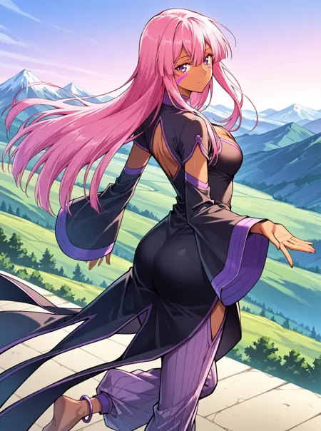 1 girl, solo, purple eyes, pink hair, long hair, bangs, hair between eyes, dark skin, dark-skinned female