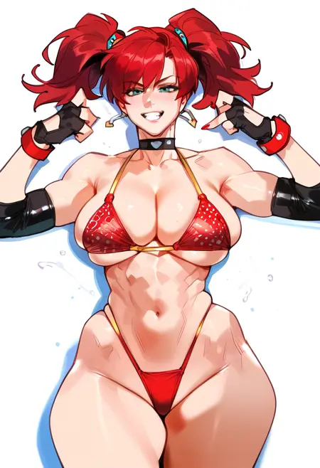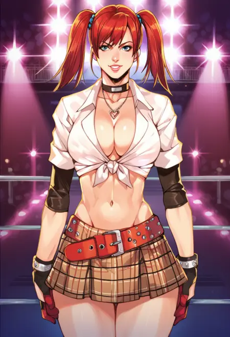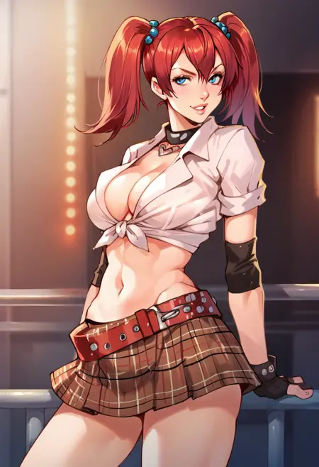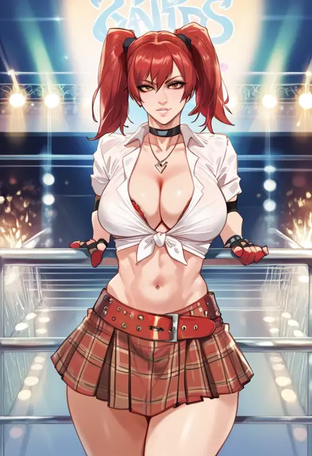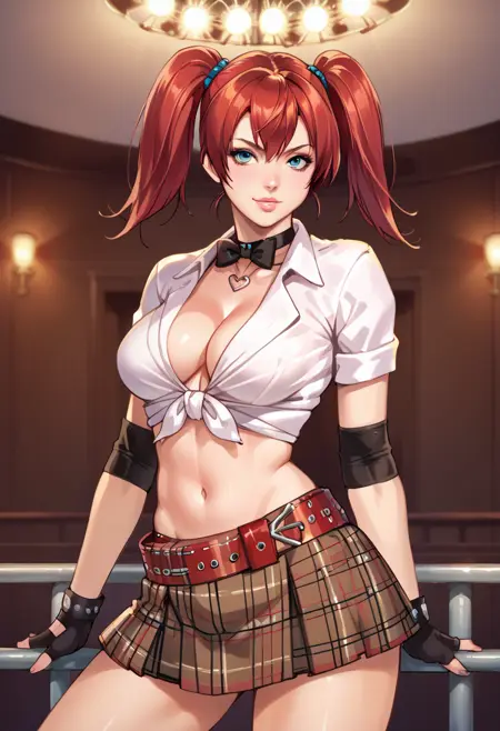 触发词:candycane, large breasts, twintails, red hair female, gloves, cleavage, tied shirt, navel, midriff, plaid skirt