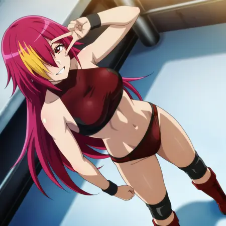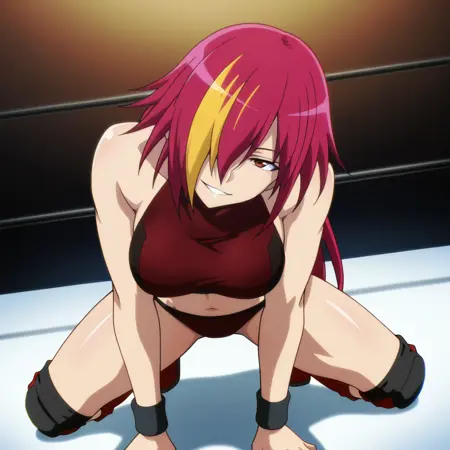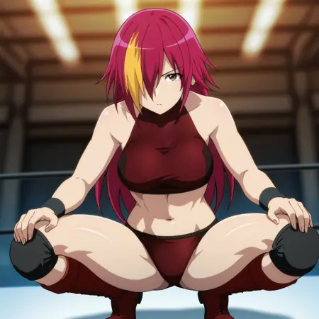 Kurea_Komiyama, 1girl, solo, red eyes, long hair, multicolored hair, blonde hair, red hair, streaked hair, hair over one eye, wrestling outfit, crop top, bare shoulders, midriff, navel, wristband, knee pads, knee boots