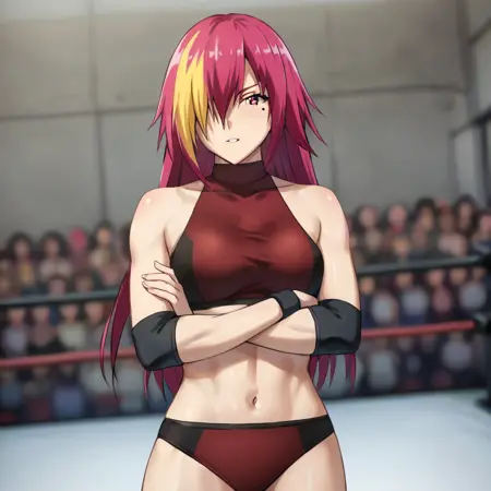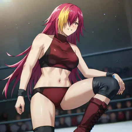 | 训练词汇 | Kurea Komiyama, 1girl, solo, red eyes, mole under eye, long hair, multicolored hair, blonde hair, red hair, streaked hair, hair over one eye, wrestling outfit, crop top, sports bra, bare shoulders, midriff, navel, wristband, knee pads, knee boots已复制! |