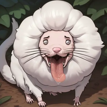 ferret, white fur, fluffy fur, hairless face, pink nose, whiskers, black eyes, hairless hands, hairless toes, tail,