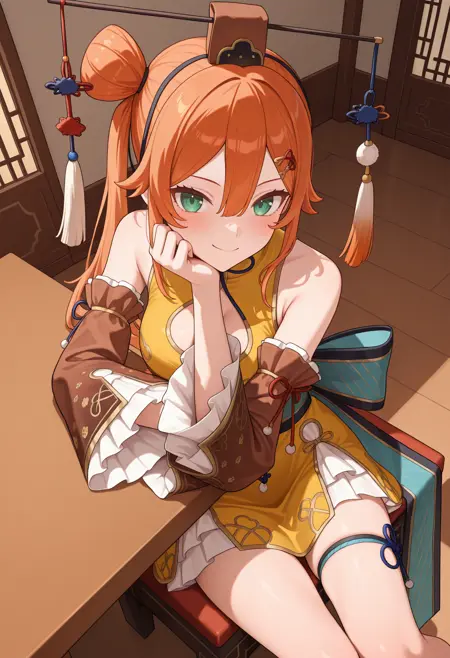 dalachi \(頭飾り\)、無限結び目、黄色のドレス、中国風ドレス、肩出し、服の切り抜き、胸元、アクア色の帯、背中のリボン、取り外し可能な袖、広い袖、茶色の袖、フリル付き袖、太ももリボン、