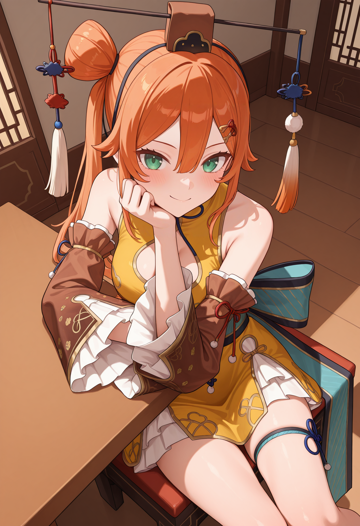 dalachi \(headdress\), endless knot, yellow dress, china dress, bare shoulders, clothing cutout, cleavage, aqua sash, back bow, detached sleeves, wide sleeves, brown sleeves, frilled sleeves, thigh ribbbon,