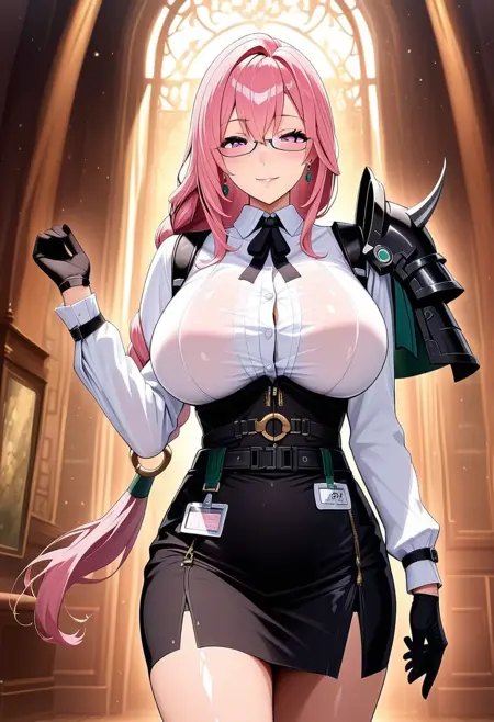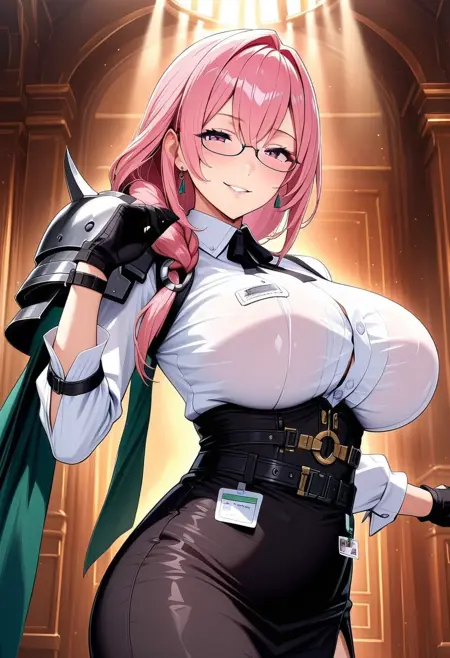 触发词:yanagi_a_xl,大乳房,粉红色眼睛,粉红色头发,长发,头发遮住眼睛,侧发辫,编发马尾,发圈,环形发饰,发带,绿色发带,耳环,眼镜,肩甲,黑色颈带,白色衬衫,荷叶边袖子,黑色腕带,腰带,黑色腰带,低胸,高腰裙,黑色裙子,工牌,黑色手套,