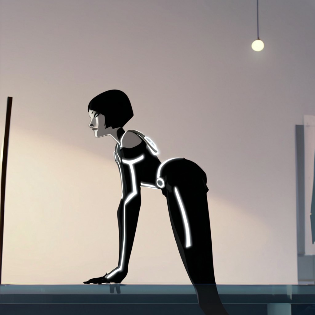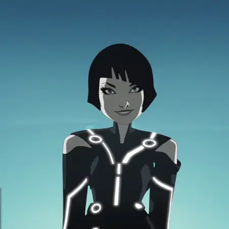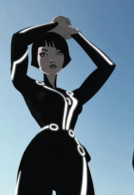 dark hair, bob cut , blue eyes, black bodysuit, neon trim, long legs, long sleeves,