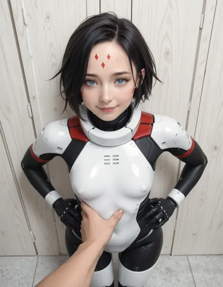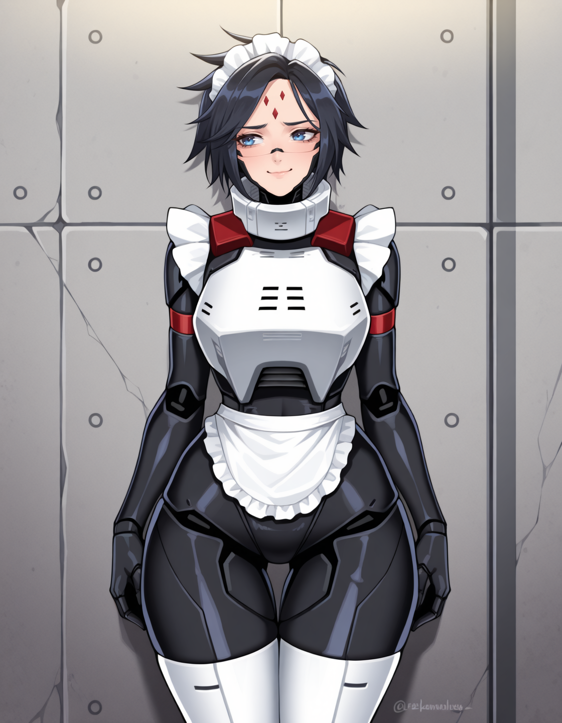 blue eyes, black hair, android, short hair, facial mark, joints, breasts, robot joints, cyborg, armor, forehead mark, wide hips, robot girl, breastplate, mechanical legs, mechanical arms,
