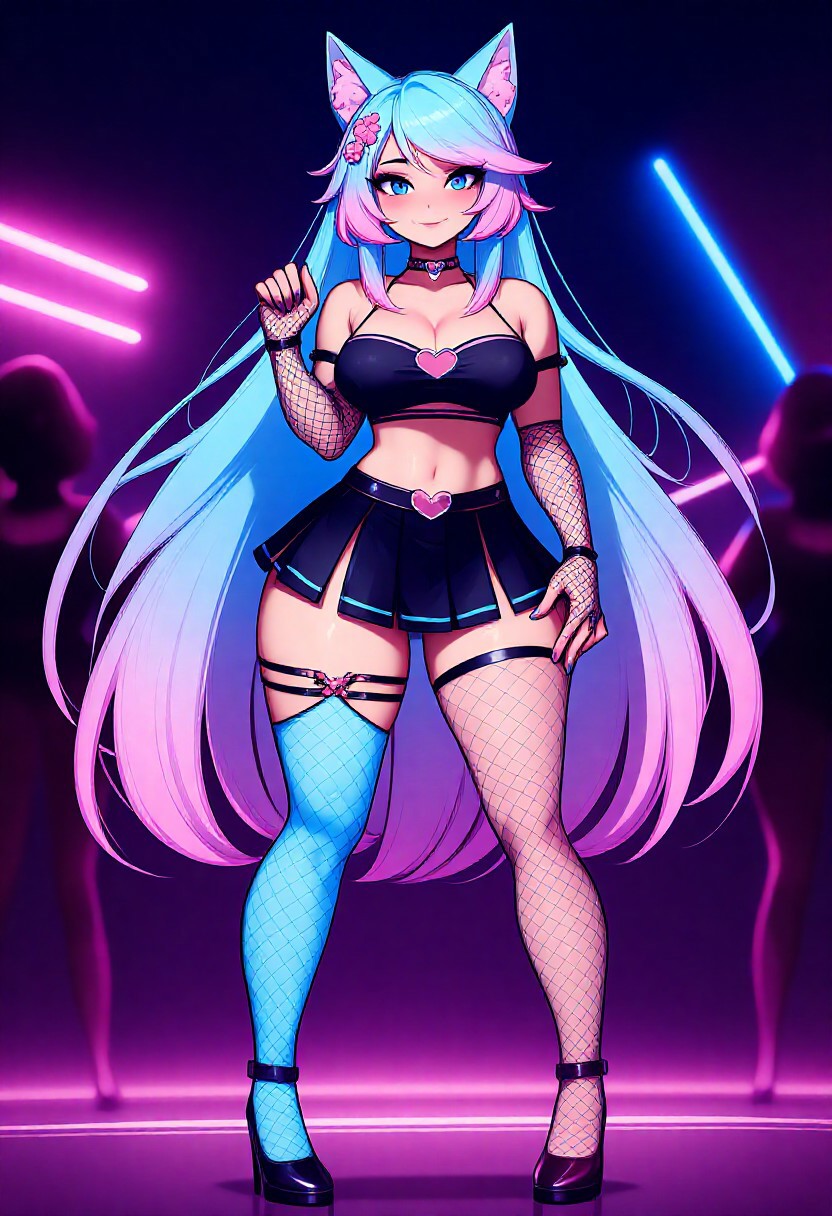 (VTuber_Silvervale, 동물 귀 털, 동물 귀, 파란 눈, 긴 머리, 다색 머리, 다색 꼬리, 분홍색과 파란색 귀, 분홍색과 파란색 머리, 분홍색과 파란색 꼬리, 줄무늬 머리, 젖힌 앞머리, 머리 장식, 허벅지까지 양말, 두꺼비 꼬리, 늑대 귀, 늑대 소녀, 늑대 꼬리, 검정 크롭탑, 검정 치마, 피시넷 장갑, 파란 허벅지까지 양말, 분홍 허벅지까지 양말, 심장 모양 동공)
