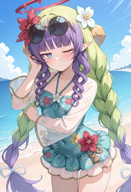 - amthsum,双马尾,低绑双马尾,花朵,眼镜戴在头上,太阳镜, Aqua色连体泳衣,连衣裙式泳衣,吊带式,花卉图案,树叶图案,透明袖子,长袖,荷叶边泳衣,Aqua色一体式泳衣,透明裙摆,绳子,