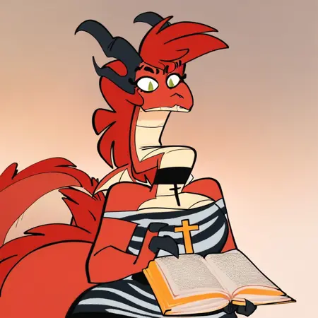 Starr, dragon girl, red skin, green eyes, horns, tail, large tail, claws, wings, striped dress, shorts, star belt, choker, cross choker, large hips