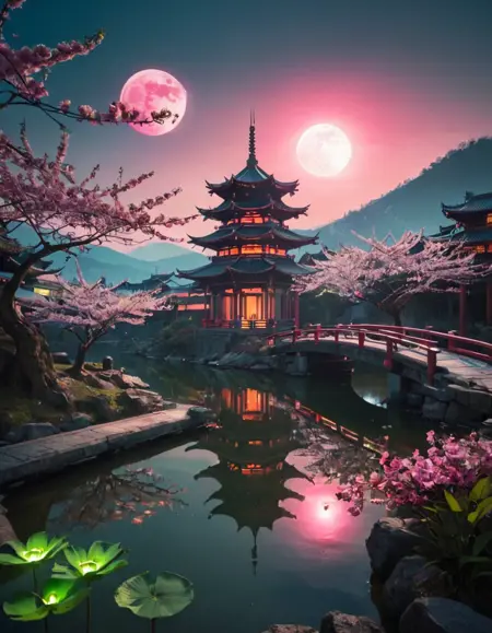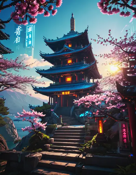 사이버펑크(및 일반) 아시아 사원을 생성합니다. 애니메이션과 사진 모두 가능합니다.