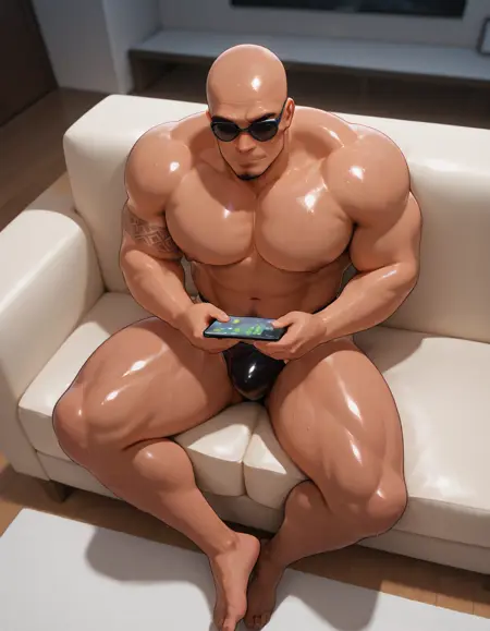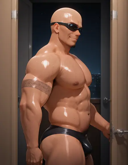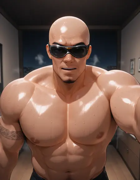 gglman, swim goggles, bald, (arm tattoo:0.6),