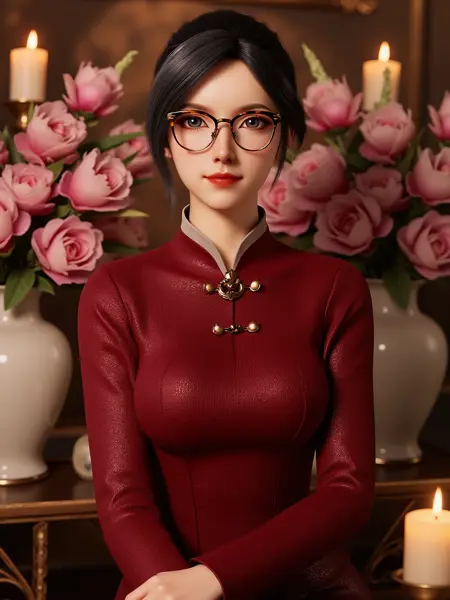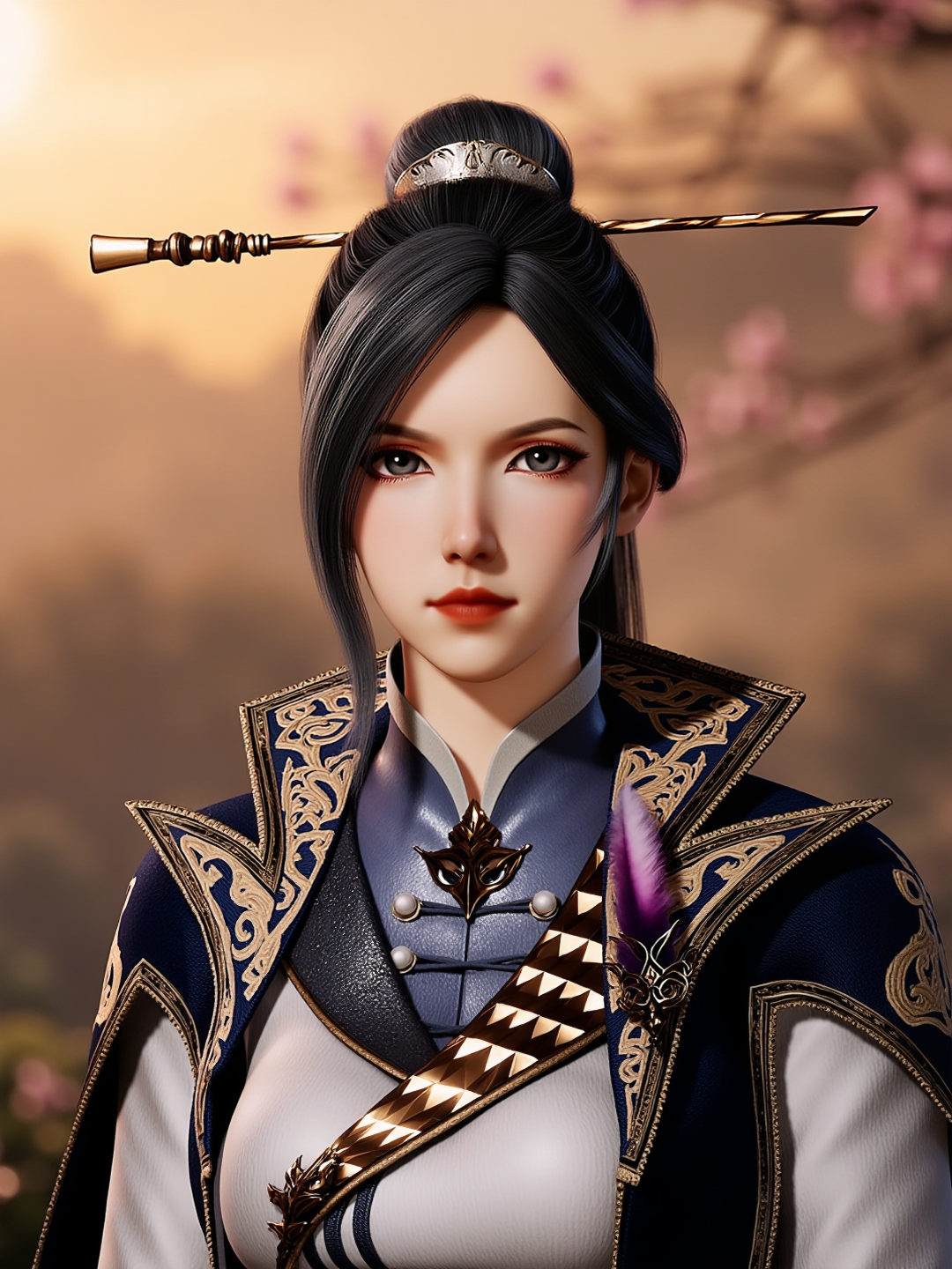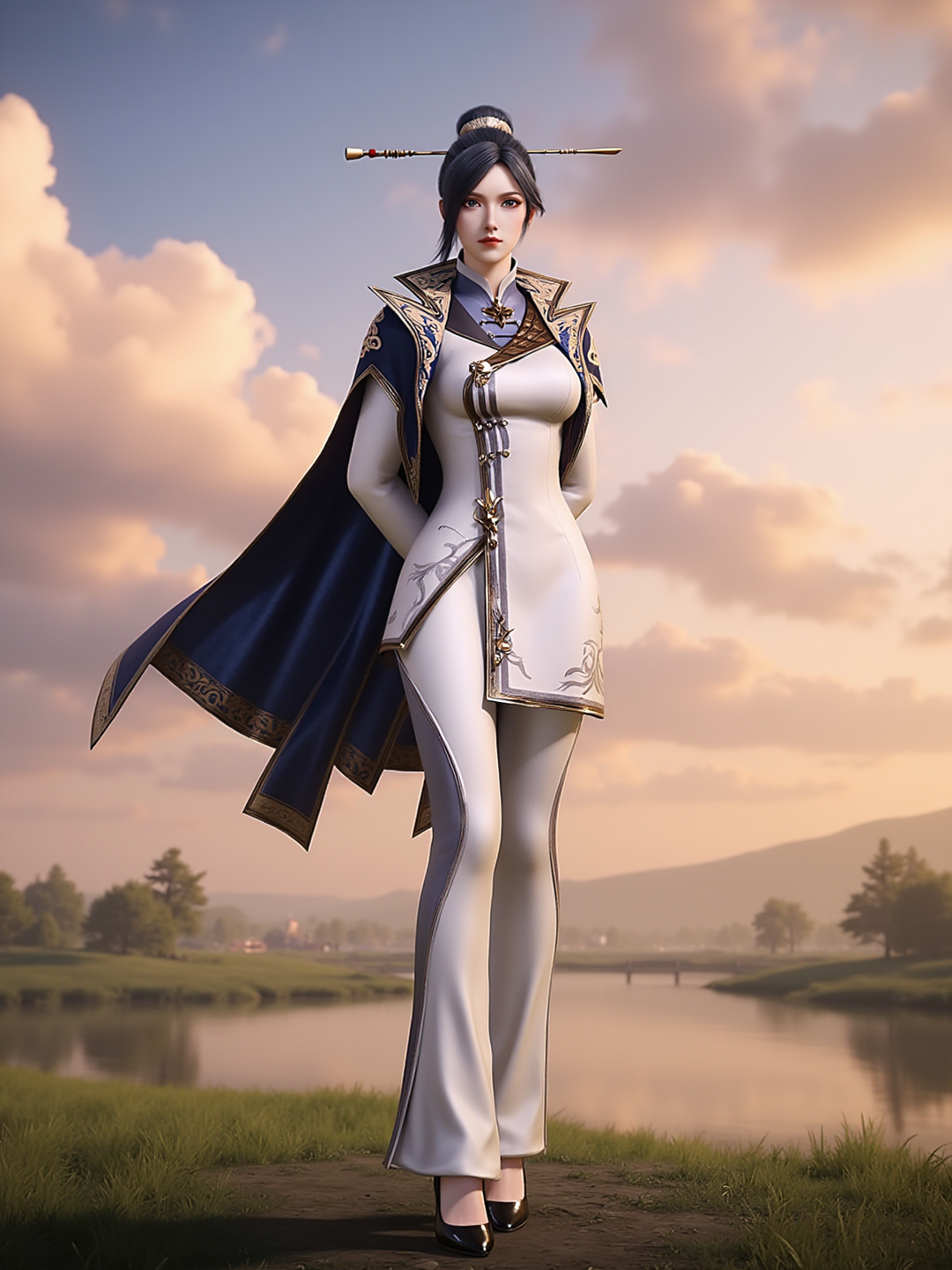 - 服装:高领、中式服装、蓝色斗篷、白色长裤