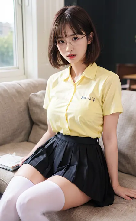 トリガー語: tjmgv1, yellow shirt, pleated skirt, black skirt, uniform, clothes writing, breast pocket,