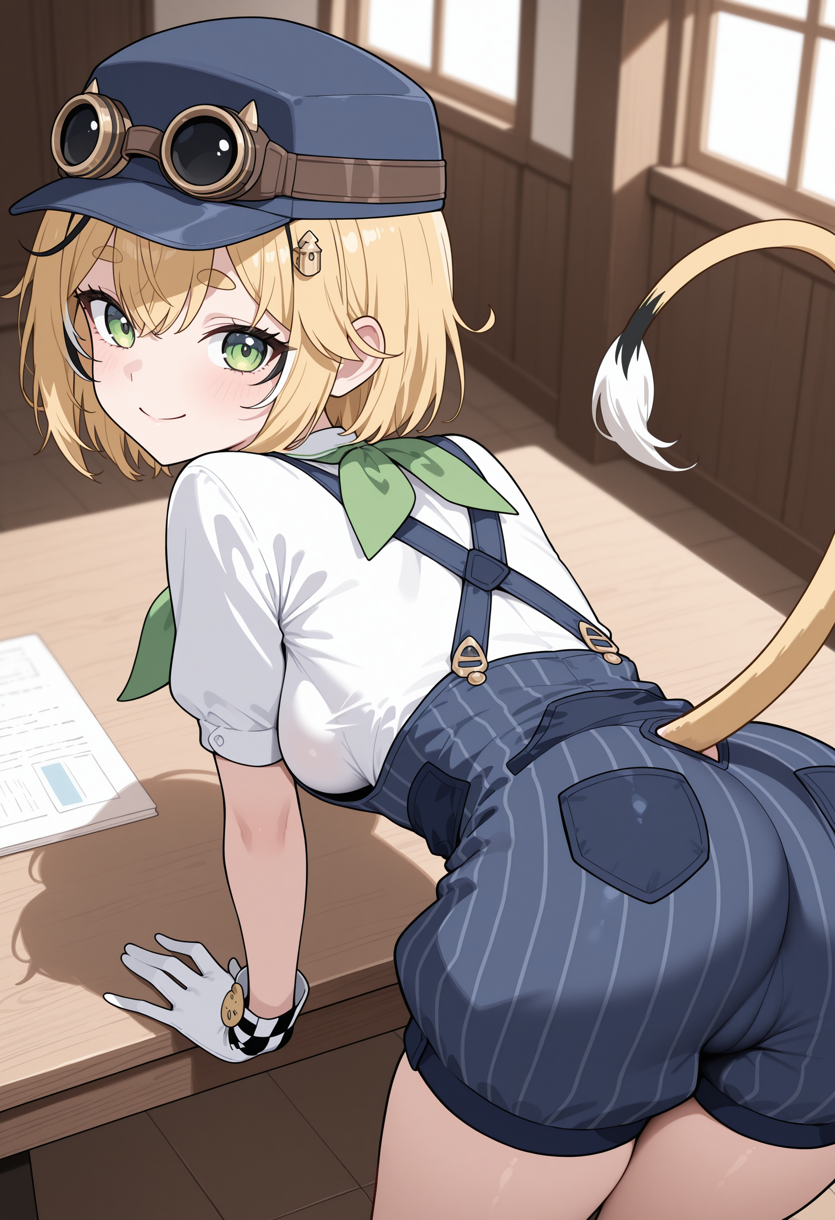 dooby3d, 1girl, solo, mouse girl, blonde hair, black hair, white hair, multicolored hair, green eyes, tail, short hair, gloves, checkered gloves, blue overalls, goggles on headwear, shirt, short eyebrows, hair ornament, blue hat, green neckerchief, medium breast