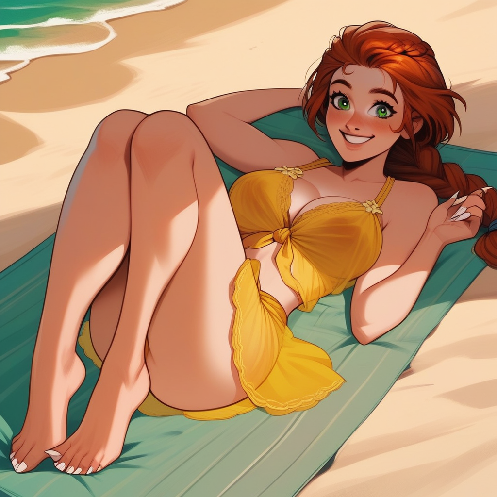 curvy, bright green eyes, one big Braid, Long Hair, auburn hair, Long legs, bubble Butt, large Natural breasts, Happy, smiling, White Long fingernails, milf,