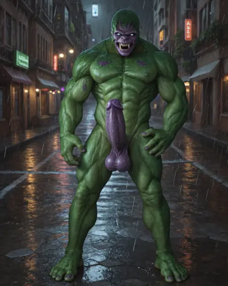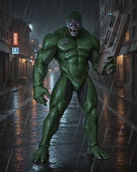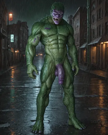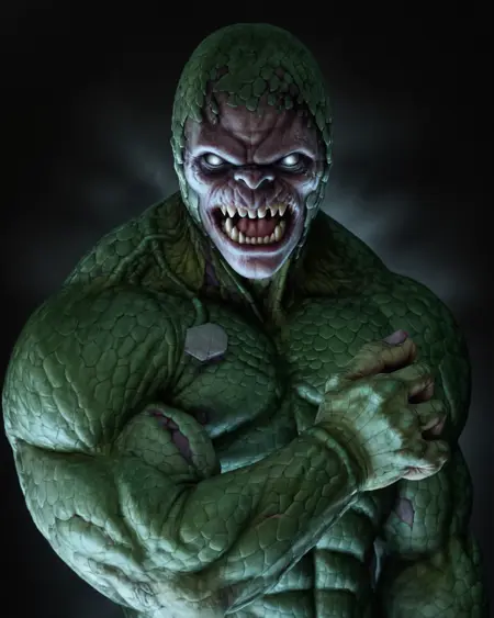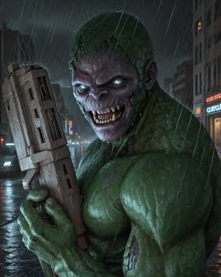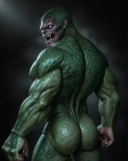辅助关键词:肌肉发达、宽肩、白色眼睛、紫色面部、布满裂纹的绿色鳞状皮肤、四指手掌