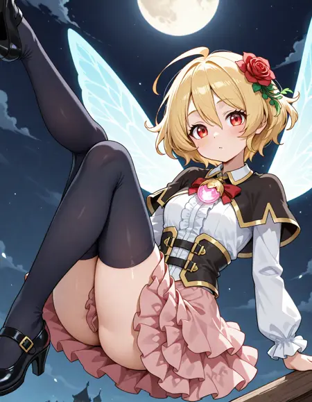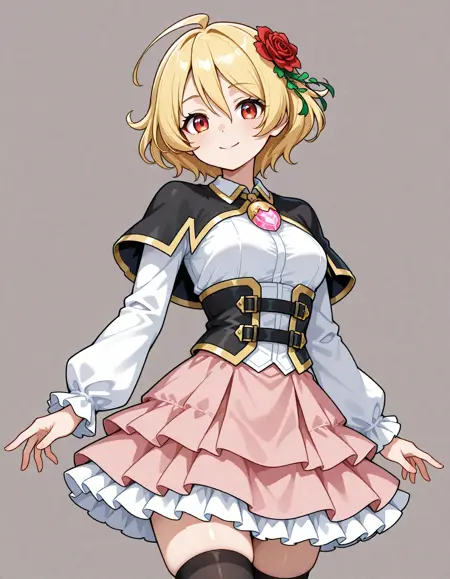 ojdefhime, red eyes, blonde hair, short hair, ahoge, hair flower, gem, dress, white shirt, black corset, white skirt, frilled skirt, layered skirt, black capelet, long sleeves, frills, black thighhighs, red shoes,