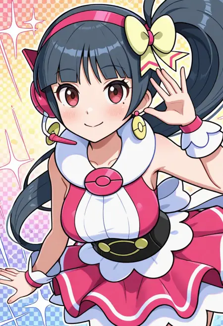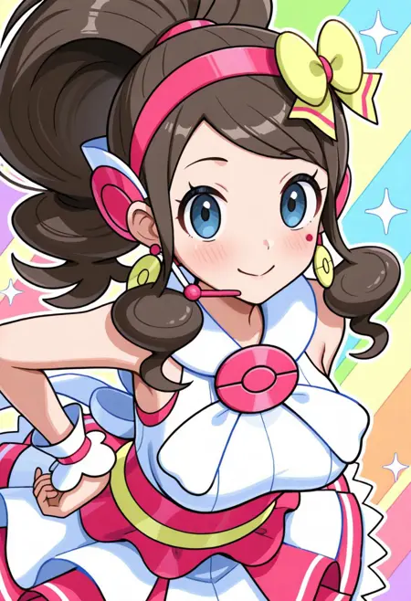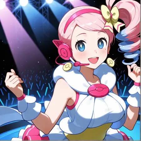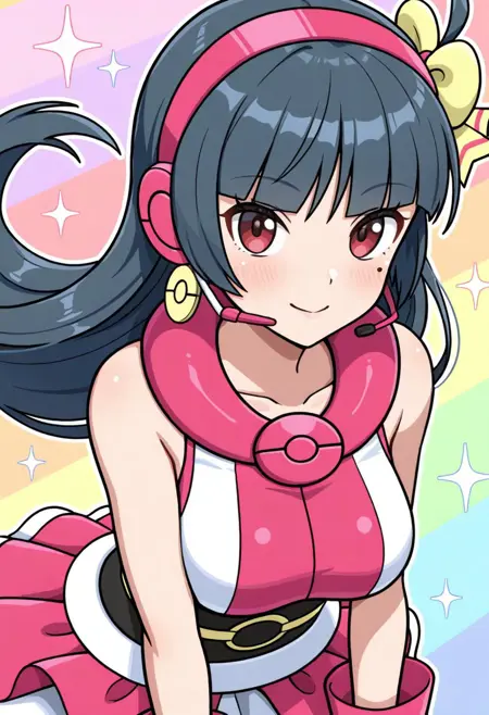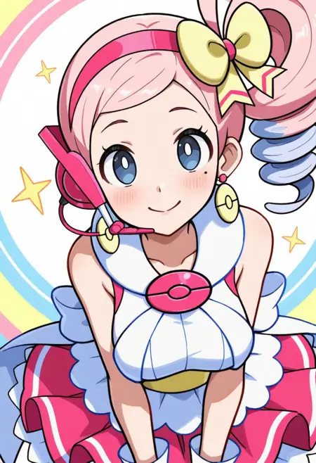 bwnancy, yancy \(pokemon\), blue eyes, white pupils, mole under eye, side ponytail, drill hair, ahoge, two-tone hair, pink hair, blue hair