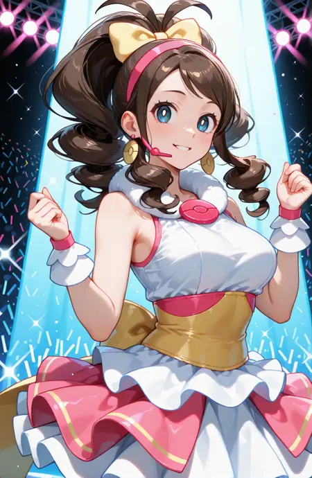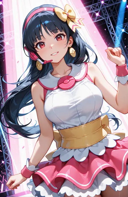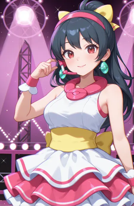 earrings, idol, hair bow, yellow bow, pink hairband, headset, microphone, sleeveless dress, yellow sash, wrist cuffs, layered skirt, two-tone skirt, pink skirt, white skirt, high heels boots, white footwear
