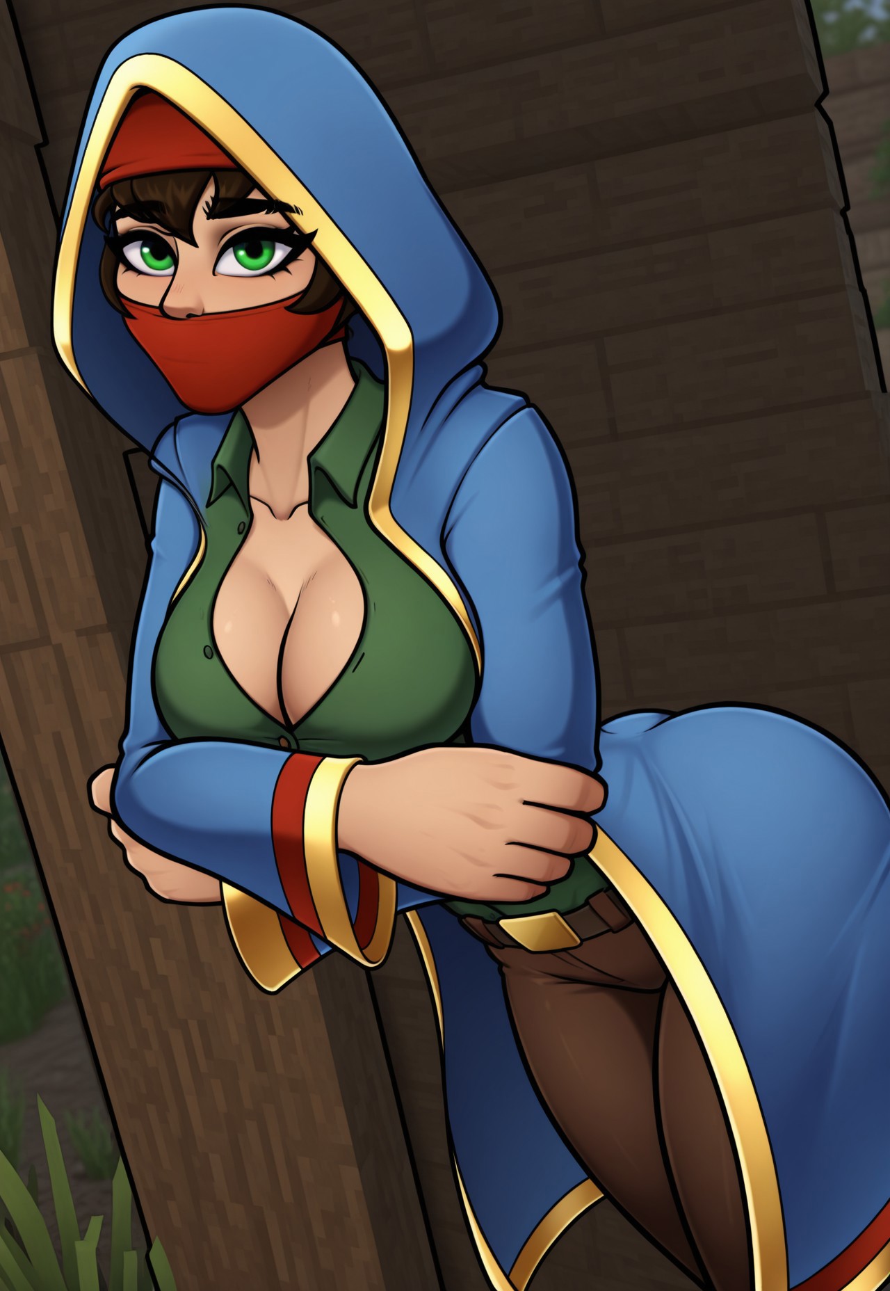 복장 1 - 마스크, 파란색 겉옷, 녹색 셔츠, 갈색 바지