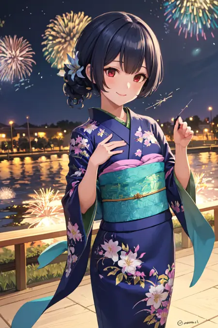 "RinzeYukata, blue kimono, print kimono, green sash"