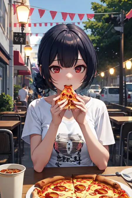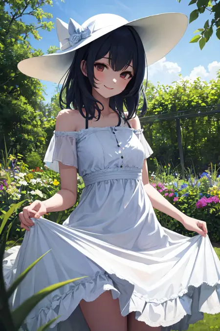 "RinzeRedDress, long hair, side ponytail, hair ornament, sleeveless, red dress"
