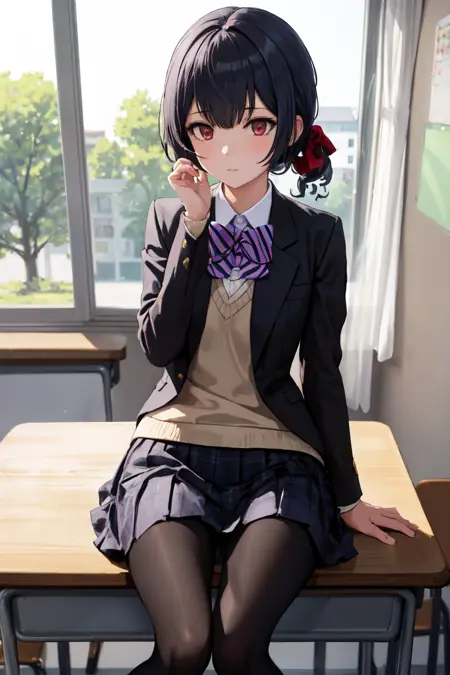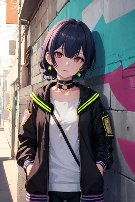 "RinzeBase, multicolored clothes, black pantyhose, frilled skirt, letterman jacket, long sleeves, purple skirt, purple belt, blue jacket, armband, white shirt, sailor collar"