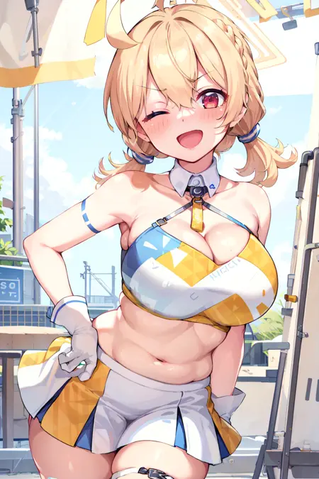 (kotori,halo,cleavage,blonde hair,mini skirt,red eyes,plump,cheerleader,ahoge,gloves,:1.0)