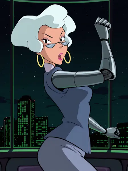 추천 프롬프트: "d_r, 1girl, old, black eyes, grey big hair, short hair, round earrings, glasses lowered nose, pink lips"