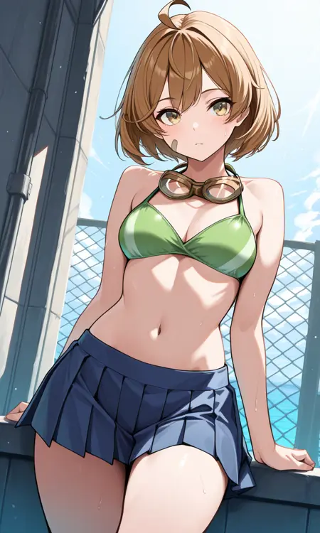 여름 복장: oborosummerKC, 단발, 배꼽, 수영복, ahoge, 비키니, 접힌 스커트, 반바지, 허리 노출, 파란 스커트, 고글, 얼굴에 반창고, 녹색 비키니, 목에 고글
